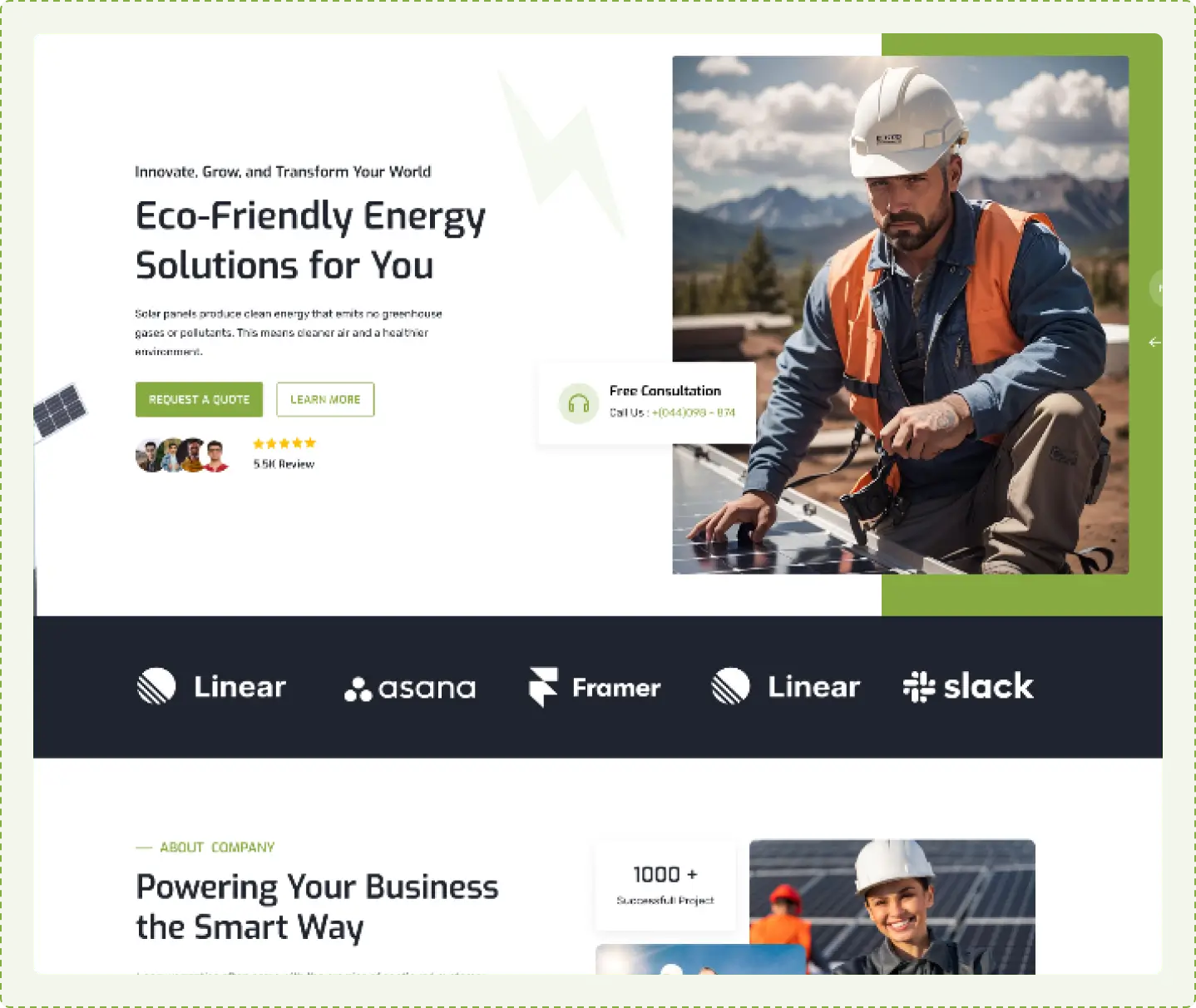 Tailored for solar businesses, energy startups, and green technology brands.Interactive elements, smooth animations, and intuitive navigation.